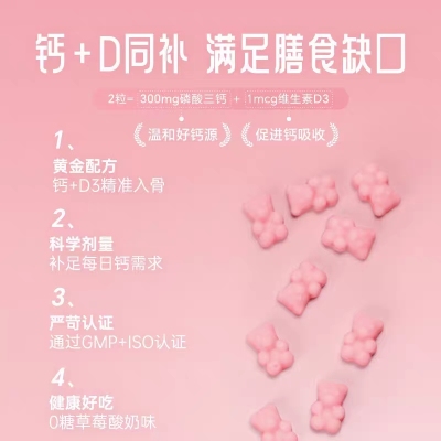钙D3小熊当然不能错过!每天吃两颗,相当于喝三大杯高鲜钙牛奶【补充300mg磷酸三钙+1mcg维生素D3而且磷酸三钙这个成分更接近骨骼的钙成分对比其他钙更温和!加上维生素D3辅助吸收让身体更容易把营养吃进去补钙!
